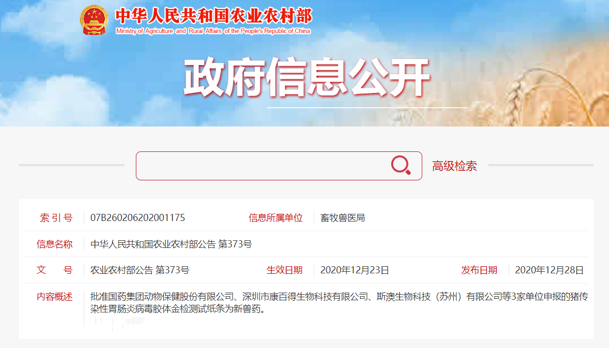 根據(jù)《獸藥管理條例》和《獸藥注冊辦法》規(guī)定,經(jīng)審查,批準(zhǔn)國藥集團(tuán)動物保健股份有限公司、深圳市康百得生物科技有限公司、斯澳生物科技(蘇州)有限公司等3家單位申報的豬傳染性胃腸炎病毒膠體金檢測試紙條為新獸藥,核發(fā)《新獸藥注冊證書》,發(fā)布產(chǎn)品試行規(guī)程、質(zhì)量標(biāo)準(zhǔn)、說明書和標(biāo)簽,自發(fā)布之日起執(zhí)行。